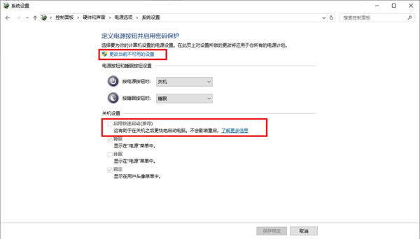 第二步、点击“更改当前不可用的设置”,然后将“启用快速启动"前面的勾去掉,点击保存修改。
