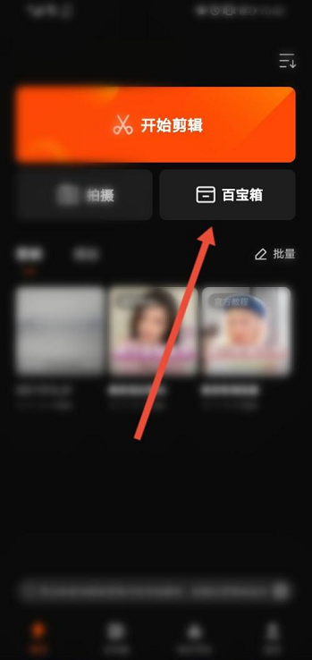 1.打开快影主页后,点击右上角的百宝箱进入。