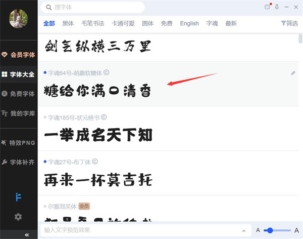 4、回到 iFonts 字体助手,在该软件中找到自己想要应用的字体样式,比如“字魂 64 号-萌趣软糖体”,左键单击,iFonts 字体助手便开始执行在 PS 里使用的指令。