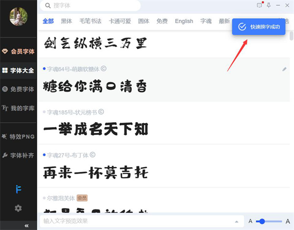 5、大概一两秒钟,在 iFonts 字体助手的右上方会弹出“快速换字成功”的提示,说明 PS 已经使用了这款字体。