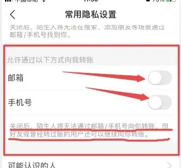 5、将“允许通过以下方式向我转账”点击关闭即可