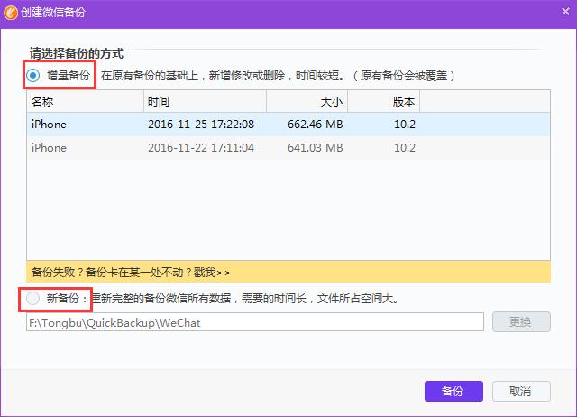 同步助手支持创建新备份,即重新完整的备份微信所有数据,所有需要的时间长。