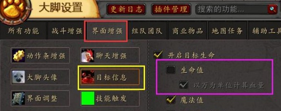 可在大脚设置-界面增强-目标信息中,选择勾选生命值选项。