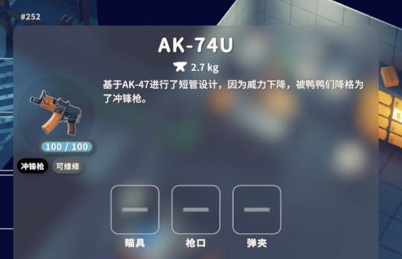 描述:基于AK-47进行了短管设计,因为威力下降,被鸭鸭们降格为了冲锋枪。