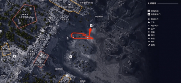 途中画圈的位置就是女王收割机的位置,沿箭头架滑索到暗门。使用暗门钥匙后即可撤离。
