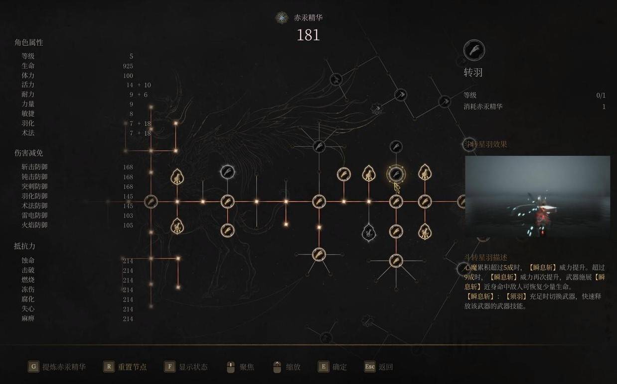 【转羽】:心魔累积超过5成时,瞬息斩威力提升。超过9成时,瞬息斩威力再次提升,武器施展瞬息斩近身命中敌人可恢复少量生命。瞬息斩:须羽充足时切换武器,快速释放该武器的武器技能。