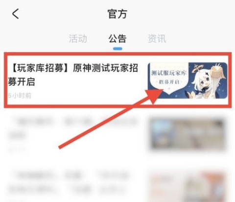5、在公告一栏里,玩家可以找到{【玩家库招募】原神测试玩家招募开启},点击进入后找到对应的测试问卷,填写后即可有机会获得测试服资格。
