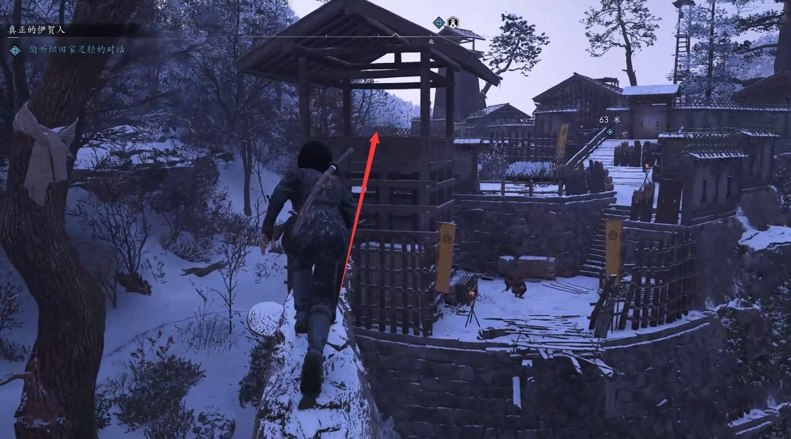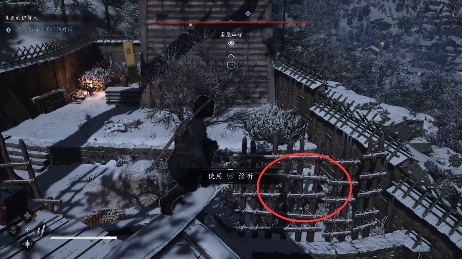 使用钩锁进入营地后,爬到高处按L2键偷听“织田家足轻”的对话。