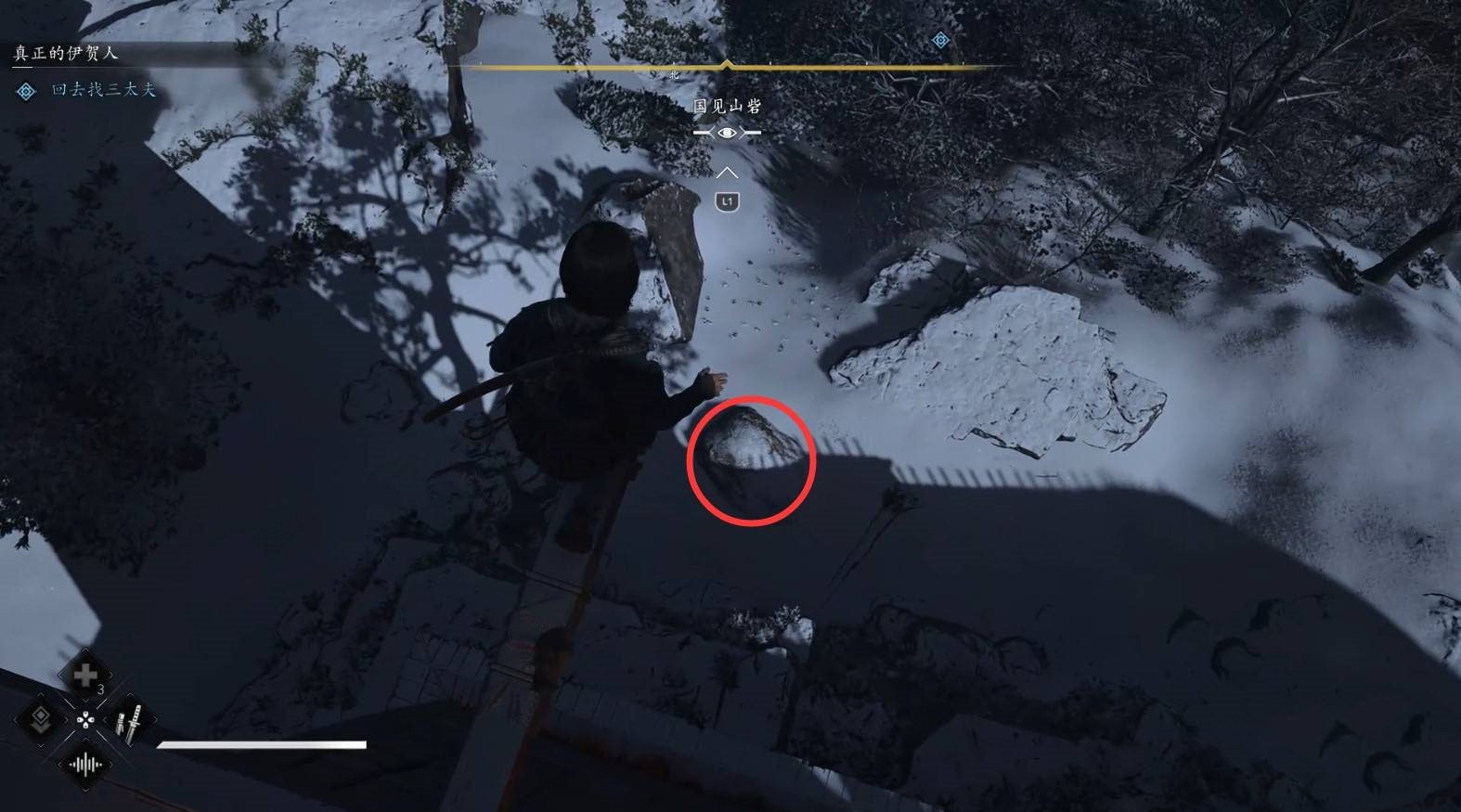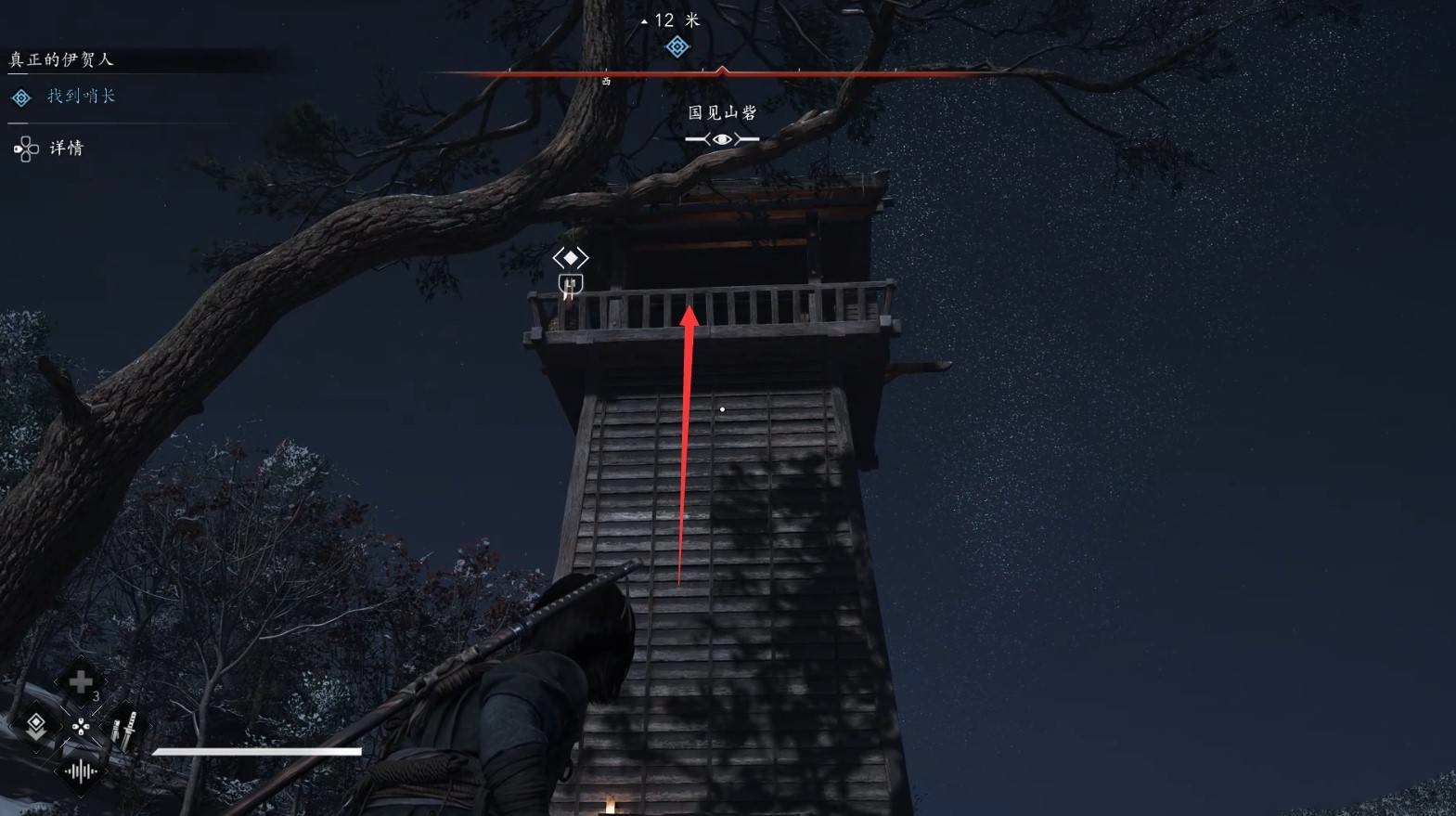 进入支线后,和NPC三太夫对话,接着爬上树枝,使用钩锁进入营地内。