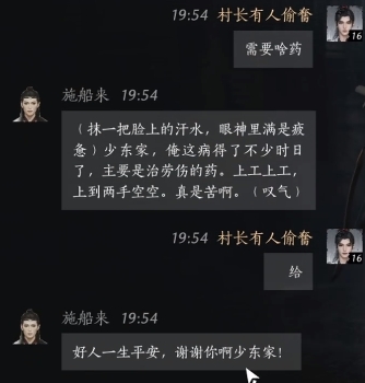 玩家可以问他需要些什么药,施船来会告诉玩家自己病了不少时日了,需要治劳伤的药,然后和他说自己会给他药就可以了。