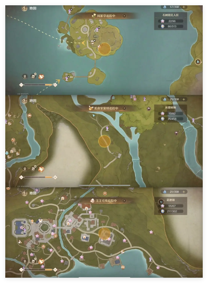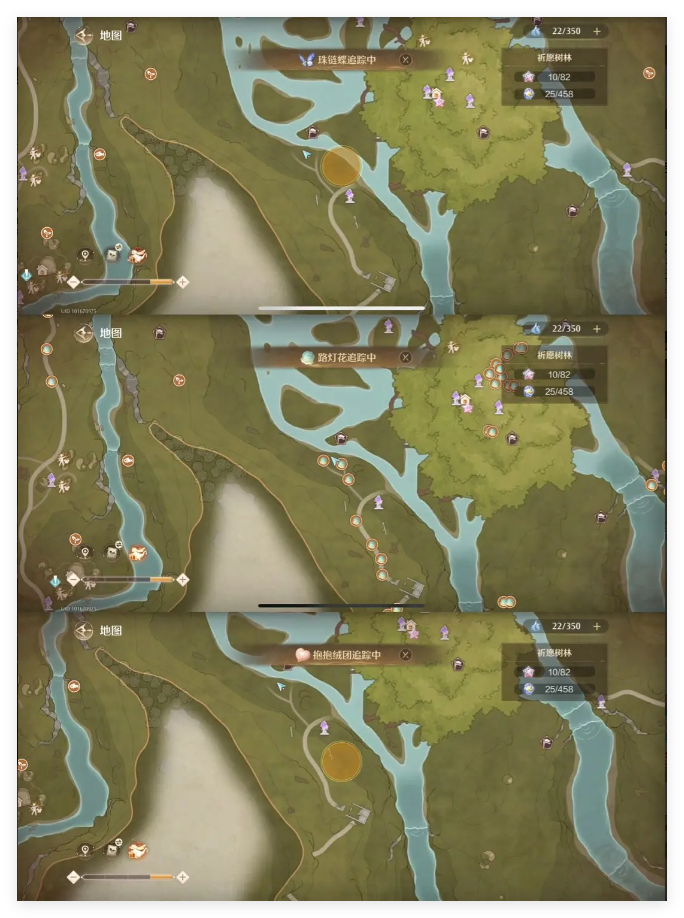 图中圆圈可捕捉,捕捉一只后可以在地图中开启追踪。(以上材料美鸭梨挖掘都可以挖掘)10)滋滋花粉精粹、兔尾绒团精粹、满满果精粹~