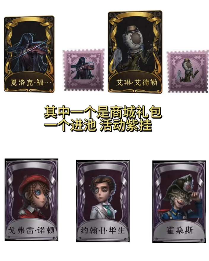 1、第五人格×福尔摩斯的联动皮肤预计将会有夏洛克福尔摩斯,以及艾琳爱德勒这两个人物。紫皮的话可能会出戈弗雷诺顿、约翰华生、霍桑斯等角色。