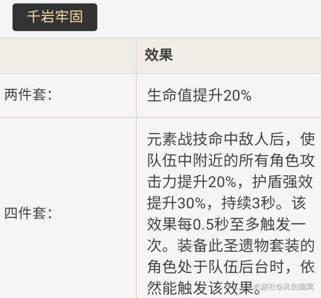 千岩是1.5版本的新圣遗物,就是触发效果比较麻烦,如果队伍其他人带了宗室4件更好。