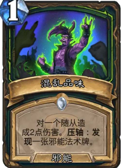 在使用【混乱品味】这张牌的时候,如果在剩余两费的情况瞎打出这张牌,便只能打2。但如果在仅剩1费的时候使用,那么打2的同时还能发现一张邪能法术牌。