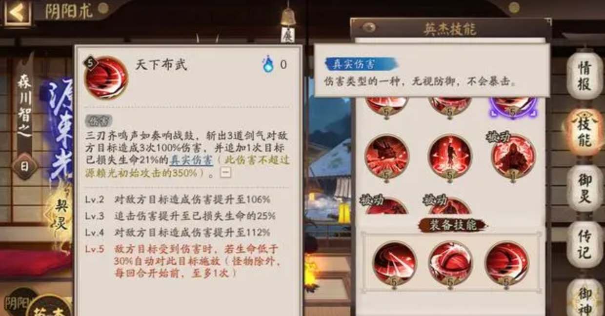 天下布武:3次100%伤害并追加1次目标已经损失生命21%的真实伤害。