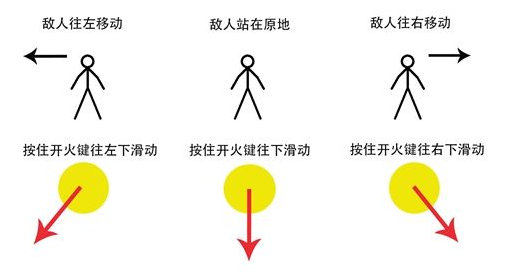 用手滑的方式进行压枪,就是按住开火键匀速下滑。如果敌人是站在原地的话,用手指直线向下滑动即可;如果敌人向左(右)移动,那就用手指匀速向左下(右下)滑动。
