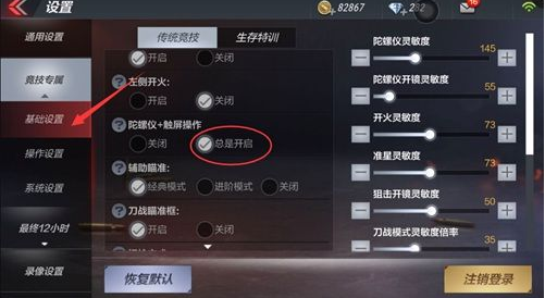 (2)陀螺仪开启方法:打开设置—竞技专属—基础设置—陀螺仪 触屏操作 选择<总是开启>
