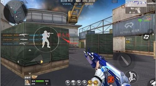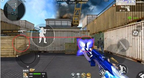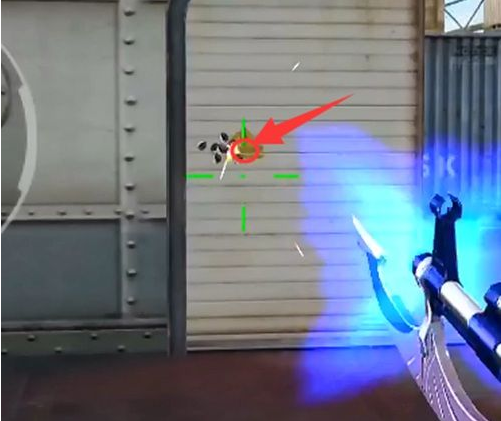 (1)站在右侧出口,对着面前的集装箱进行左右横向扫射,扫射时将枪口的准星高度控制在这两个箱子顶部连成的红线即可。