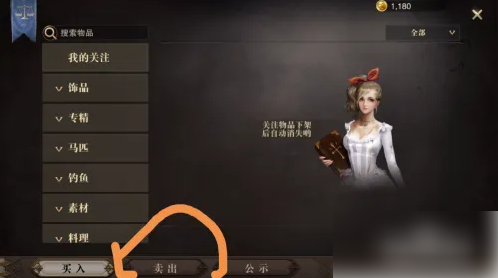 这里就是我们的玩家拍卖行,买东西跟卖东西的都是玩家,一进来是“买入”页面,我们点击下方的“卖出”