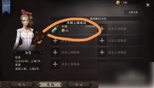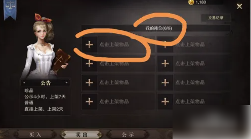 进入卖出页面之后,我们看到我的摊位那里,我们可以放8件东西进行上架拍卖,随便选择一个进行上架物品