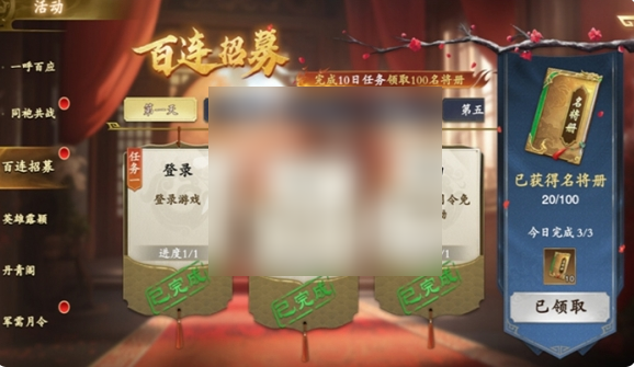 每天完成3个任务,可获得10个名将册,10天一共有100个名将册。100个名将册进行招募,这是初期最快获取名将册的渠道之一,而且参与门槛相对简单。