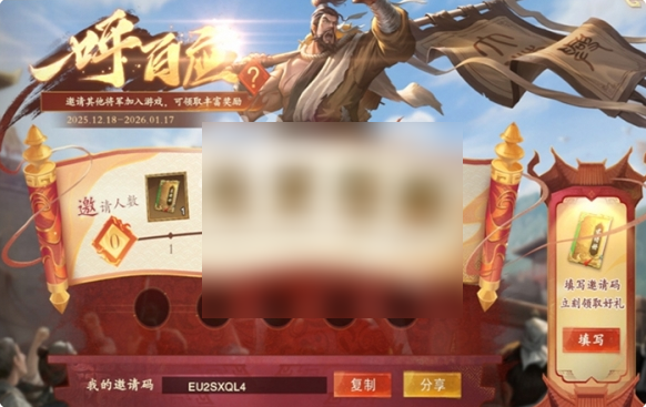 邀请其他玩家加入游戏,可领取丰富奖励,5名玩家可获取5个名将册。这个活动会周期性开启,好友进入游戏后在这个界面填写自己的邀请码即可。
